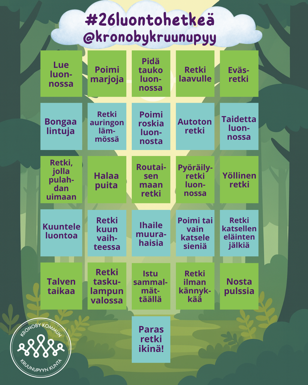 Kronoby kommun bjuder in dig att vara med i utmaningen #26naturupplevelser – helt i din egen takt och med en lättsam inställning. Målet med utmaningen är att uppmuntra till varierat friluftsliv året runt.
